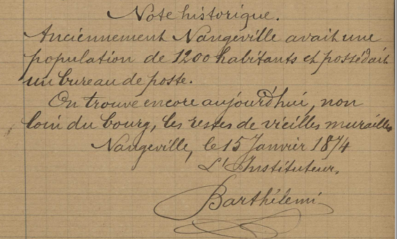 Les archives de la ville d’Orleans (base Aurelia) conservent une description de Nangeville faite en 1874 par l’instituteur du village, Mr Barthelemi. Ce travail etait probablement le fruit d’une demande faite a tous les instituteurs du departement. Mr Barthelemi y decrit la geographie et l’economie du village. Il souligne la recente forte amelioration des chemins…