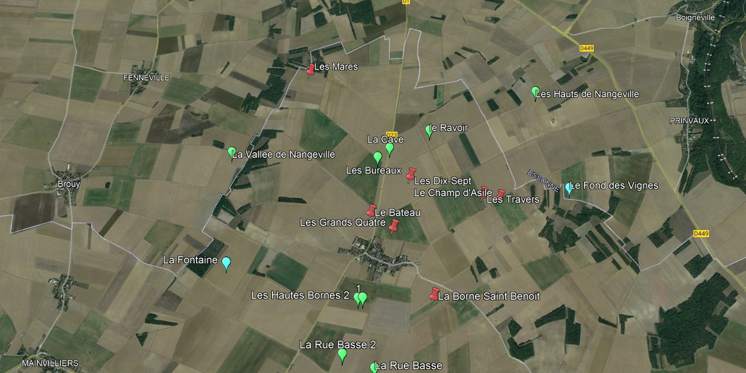 On note une claire concentration de fermes sur un axe nord-sud, autour de la route actuelle Oinville-Nangeville-Champmotteux. Pas moins de 10 sites !