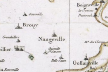 Nangeville sur la carte de Cassini Réalisée sur l’ensemble de la France, et pour la région de Nangeville vers 1760-1770 (date exacte à préciser), premiere carte nationale, la carte de Cassini, peu détaillée, permet néanmoins de bien repérer Nangeville et les hameaux proches (Oinville, Bellesauve