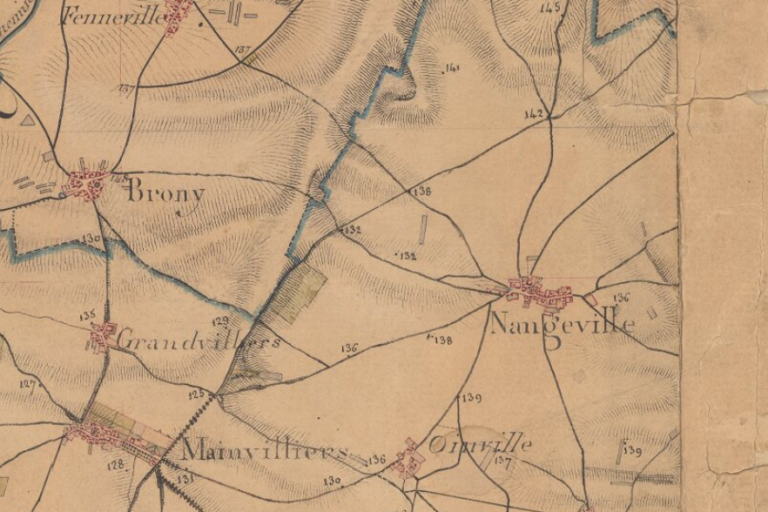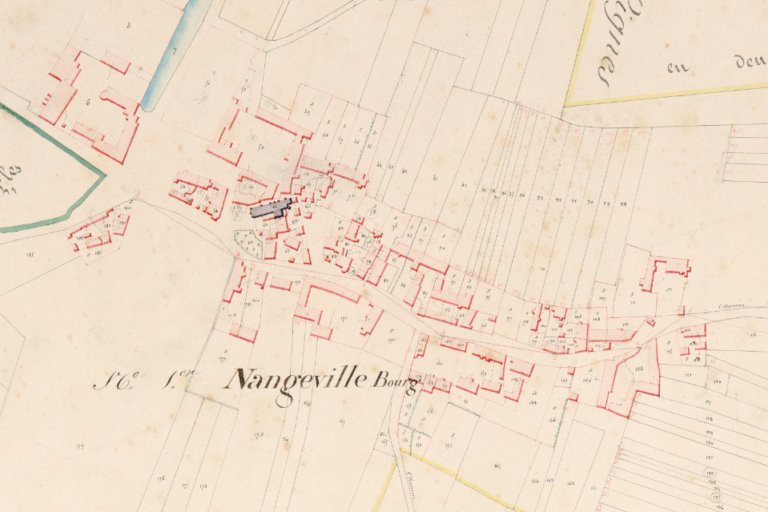 Outre les plans contemporains (photos aériennes et cadastre), sont accessibles les plans nangevillois du cadastre napoléonien réalisé vers 1836 (voir un détail dans la photo ci-dessus qui montre le plan de la ferme de Tour Ronde avec le tracé de la tour, détruite vers 1870) et de la carte d’état major levée au milieu de XIXème siècle. Peut-être des archives recèlent-elles des plans plus anciens, qui restent à découvrir, à l’image par exemple de l’intéressant plan de Champmotteux qui date de 1785 (il est présenté dans une rubrique spécifique).