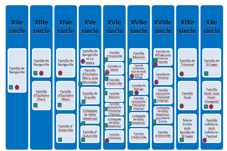 Les tableaux ci-joints presentent les étapes de la transmission des fermes de la Tour Carrée et Tour Ronde depuis le XIIe siècle. A certaines étapes, des hypothèses ont été faites et il reste des incertitudes. Cependant les sources disponibles permettent de reconstituer une tres grande partie du “puzzle”.