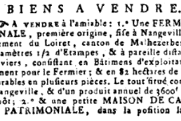 C’est l’avis de vente d’une ferme nationale (bien national, sans doute exproprié dans les années 1790) d’une superficie de 82 ha avec bâtiments. Il serait intéressant de l’identifier.
