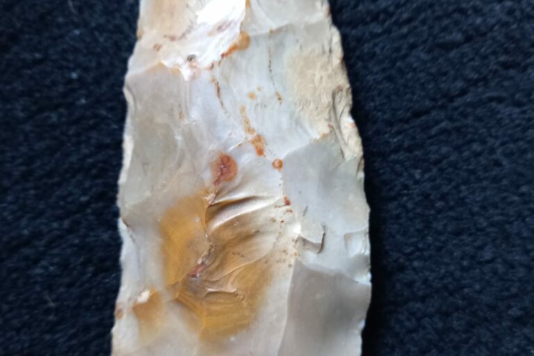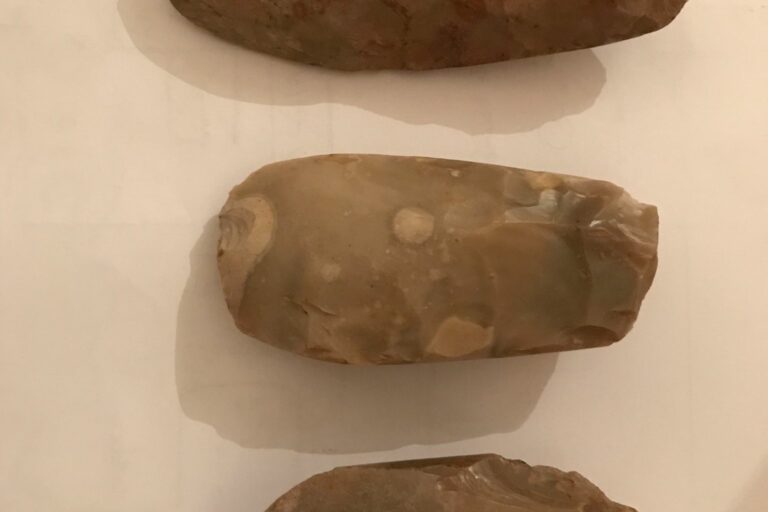 Une belle hache taillée en silex a été trouvée a Nangeville. A ce stade, il n’est pas possible de la dater : elle a pu être fabriquée et utilisée a la période néolithique (-10000 a -3000 ans) qui a été néanmoins celle du passage a l’usage des haches polies (trouvées a Nangeville en plus grand nombre). Mais elle peut aussi avoir été utilisée plusieurs milliers ou dizaines de milliers d’années auparavant, durant la période du mésolithique.