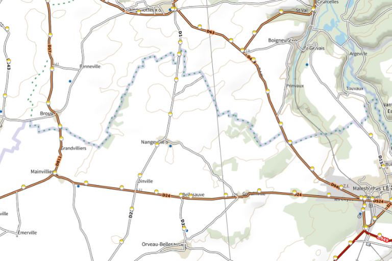 Quelques points saillants quand a la situation géographique de Nangeville : très ramasse, oriente est-ouest, situe plutot au centre de son territoire, son emplacement ne semble pas avoir été choisi en raison d’un terrain ou d’une hydrographie spécialement favorables. Probablement est-il plutôt lie au respect d’une certaine distance avec les villages voisins et au souci de se développer au barycentre de son territoire afin que tous ses points soient facilement accessibles a pied.