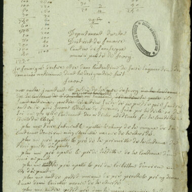- Pages 194 a 201 : textes du 24 nivose an X (1802) a propos d’un conflit entre le propriétaire – Mr Trimont – et l’exploitante (Catherine Hautefeuille, veuve Lecefne) sur les rentes et fermages (plusieurs renvois a des contrats anciens dont un du debut du XVIIe siecle). Il s’agit apparemment d’un differend quant a la qualification d’anciens droits (sont-ils seigneuriaux donc supprimes au debut de la revolution, ou non et donc encore dus ?). Parmi les references : l’information importante que Mr Francois Deville a vendu ses terres de Nangeville a Mr de Trimond en 1792 devant notaire a Paris, une allusion au bail de juin 1783 (Tour Ronde, Puisgast) au profit d’Armand Lecefne, le rappel que Jean et Francois Gramont revendiquent en mars 1755 etre les heritiers de Catherine Royer veuve de Pierre Mesmin, l’achat d’une metairie a Nangeville par Mr Lecefne le 2 juin 1786