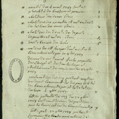 - Pages 35 et 36 (très lisible, avec dates et noms) : liste des documents contenus dans le reste du dossier, sans doute établie au début du XXe siècle.