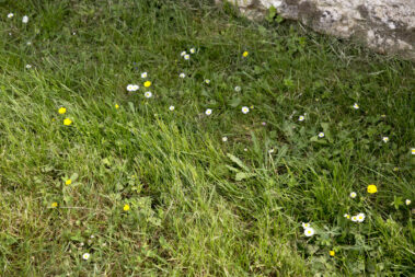 Photo : renoncule des champs (fleur jaune) ou ranunculus arvensis au pied du mur du cimetière – (Source Armand Boulier – 2022)