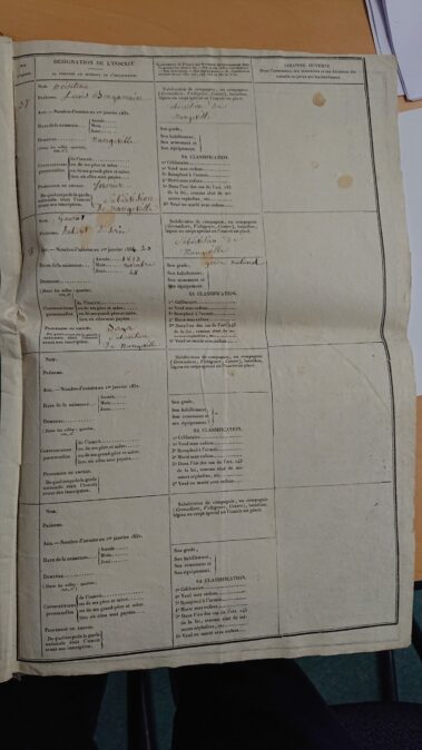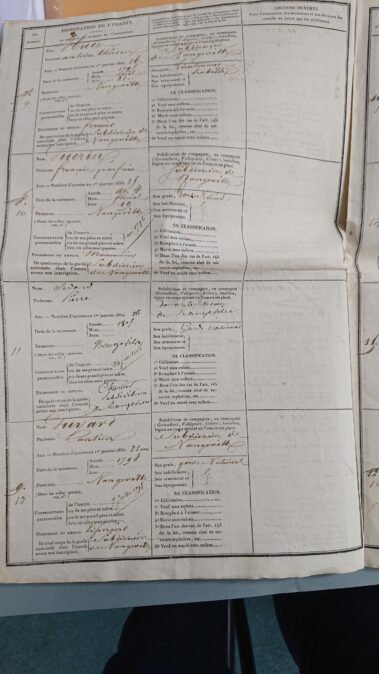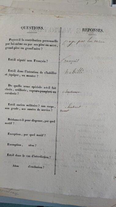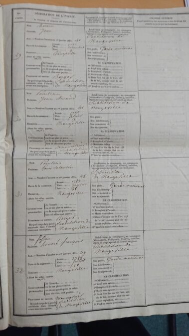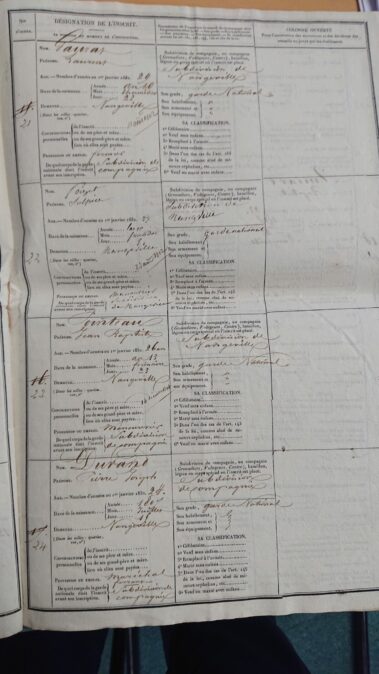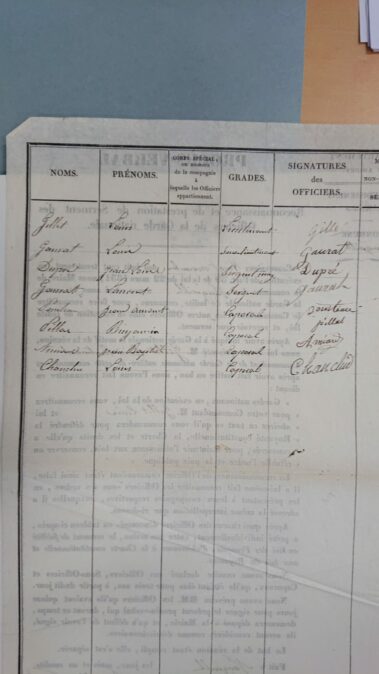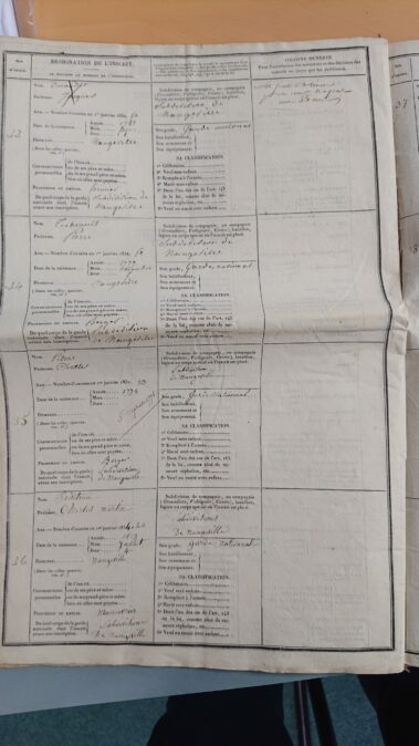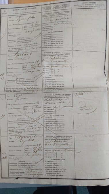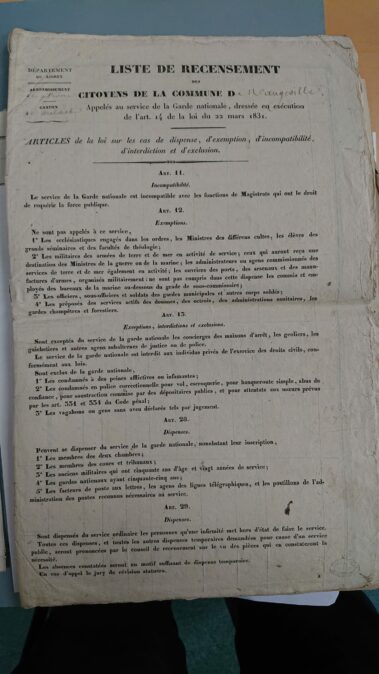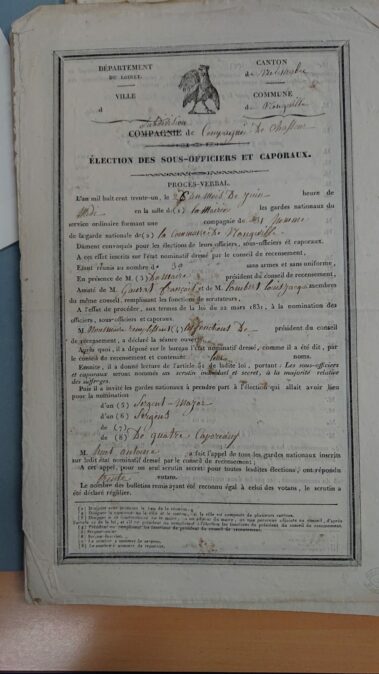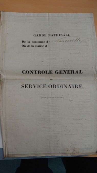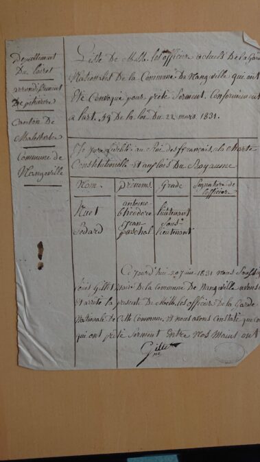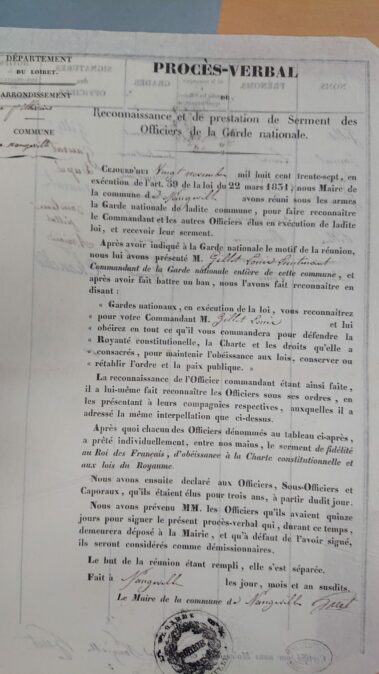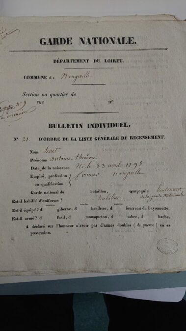 Dans le cas de Nangeville, les archives deposees a Orléans détiennent des recensements de gardes nationaux faits dans les années 1830, ainsi que des procès verbaux d’élections des officiers et sous-officiers.