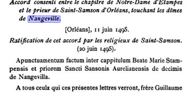 En 1495, un accord est conclu entre les religieux du Chapitre de Notre-Dame d’Etampes et le prieur du couvent de St Samson a Orleans a propos du partage du territoire de Nangeville pour la perception des dimes. La nouvelle limite semble etre le chemin de Mainvilliers a Boigneville-Buno, qui existe encore pour partie, le chemin de Nangeville a Oinville et la limite des territoires entre Nangeville et Oinville-Orveau.