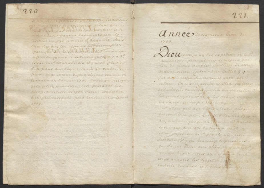 - 1709 : hiver tres rude du 6 janvier au mois d’avril. Beaucoup de gens meurent de froid aux champs (leurs corps ne sont recuperes/enterres qu’apres le degel ?). Le prix du ble explose (35 a Malesherbes puis 70 jusqu’en octobre pour 5 a 8 l’annee precedente). Fin avril et en mai on retourne le ble et plante de l’orge, malgre l’interdiction temporaire du roi (sous peine de mort). En juillet le roi ordonne a chacun de declarer le niveau de ses stocks sous peine de forte amende et d’expropriation (photos 98 et suivantes).