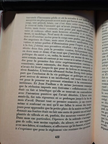 Il fait référence à son séjour dans le troisième tome – Sol Invictus – de ses mémoires (paru en 1971), mais sans citer explicitement Nangeville : il écrit qu’il a été abrité dans le village « N » du Loiret, « quelque part entre Etampes et Malesherbes, et la carte routière le réduisait à un petit point tout isolé sur un chemin secondaire qui coupait d’un trait rectiligne la vaste plaine ». Il explique que pour lui cette période a été celle d’une intense réflexion et creation philosophique.