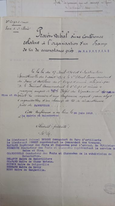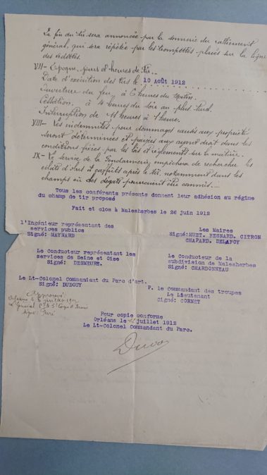 Les modalités sont discutées au préalable entre les maires et les militaires (compte-rendu de réunion de fin juin 1912, ci-dessous) , et le périmètre de tir couvre plusieurs communes (ci-dessus la carte en photo).